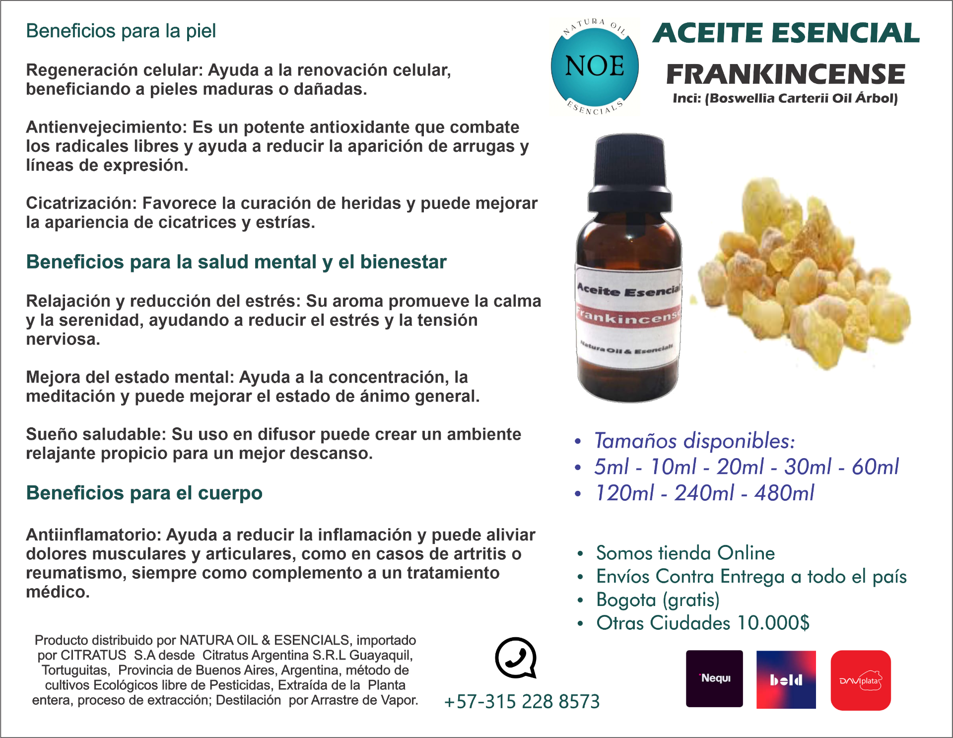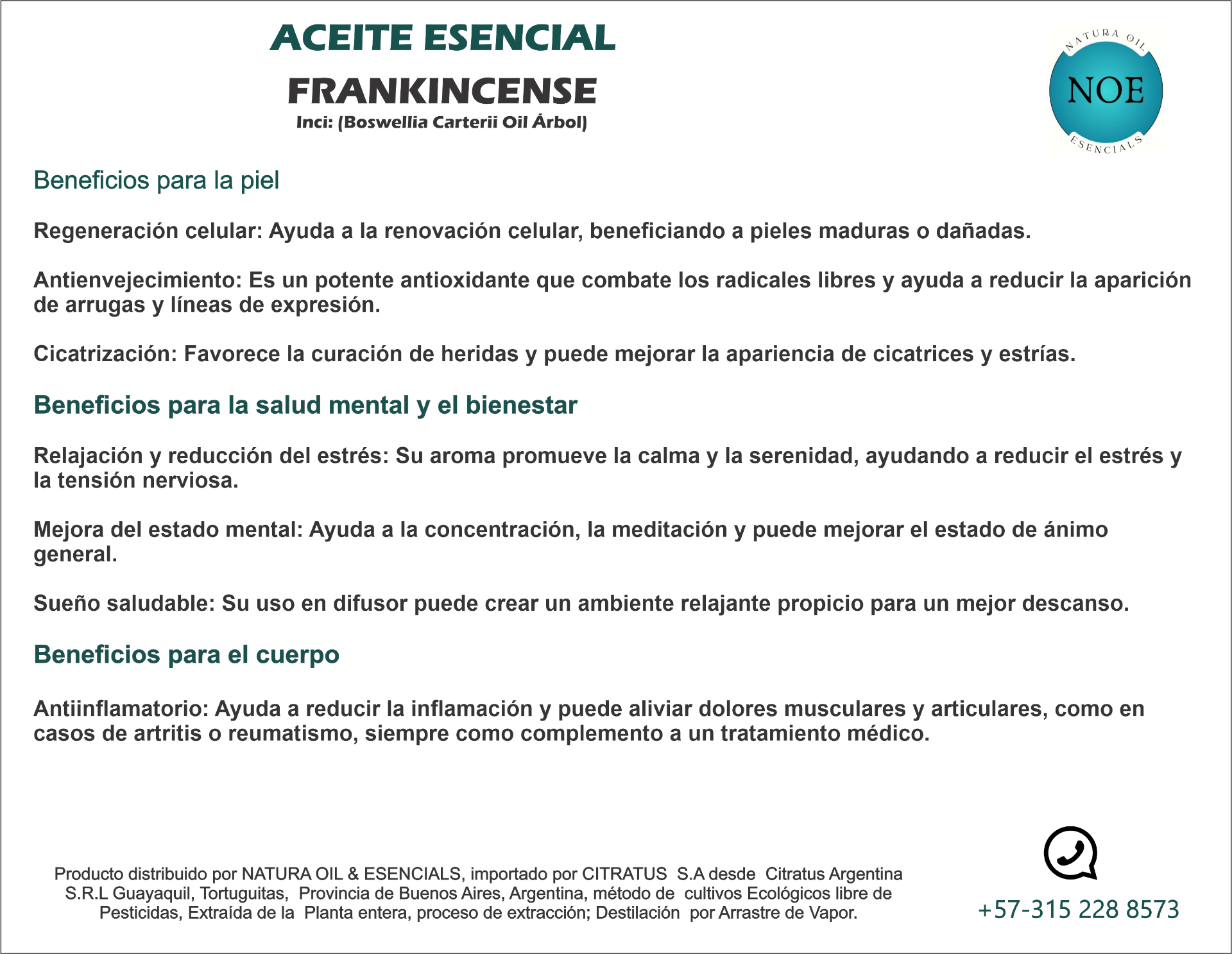 El aceite esencial de Frankincense es conocido por sus propiedades relajantes y su capacidad para promover la meditación y la introspección. Al utilizarlo en un difusor, podrás transformar cualquier espacio en un refugio de calma y bienestar. Su aroma distintivo no solo embellece el ambiente, sino que también ayuda a crear una atmósfera propicia para la concentración y la paz mental.