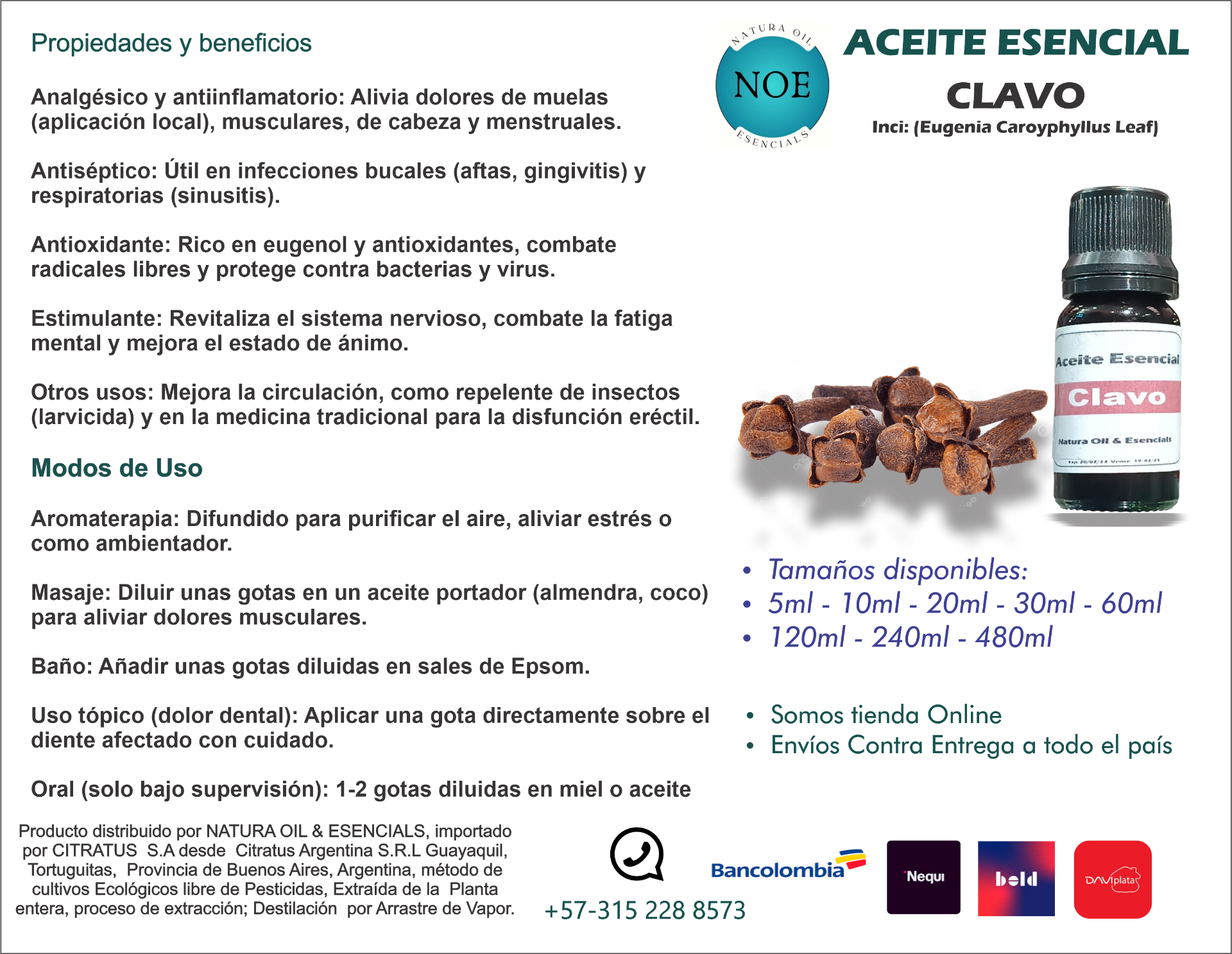 Antioxidante: Rico en eugenol y antioxidantes, combate radicales libres y protege contra bacterias y virus.