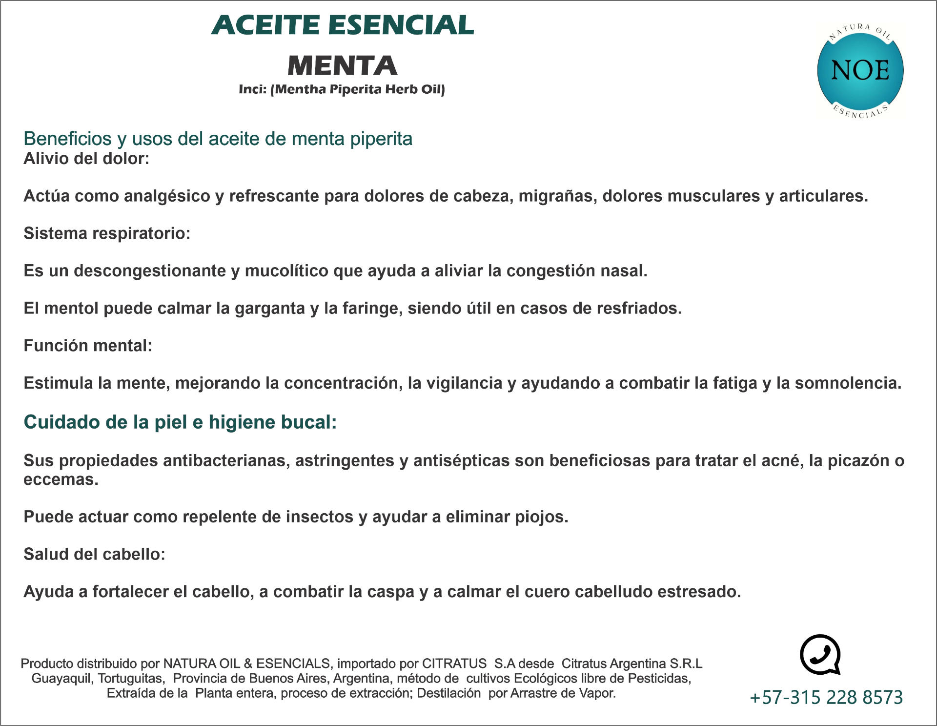 Actúa como analgésico y refrescante para dolores de cabeza, migrañas, dolores musculares y articulares.