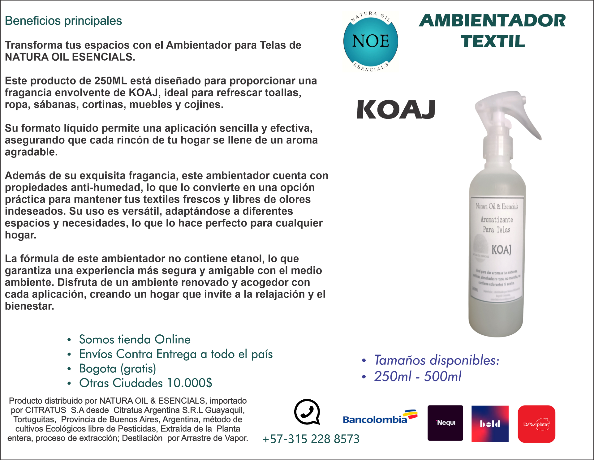 ETransforma tus espacios con el Ambientador para Telas de NATURA OIL ESENCIALS. Este producto de 250ML está diseñado para proporcionar una fragancia envolvente ideal para refrescar toallas, ropa, sábanas, cortinas, muebles y cojines. Su formato líquido permite una aplicación sencilla y efectiva, asegurando que cada rincón de tu hogar se llene de un aroma agradable.